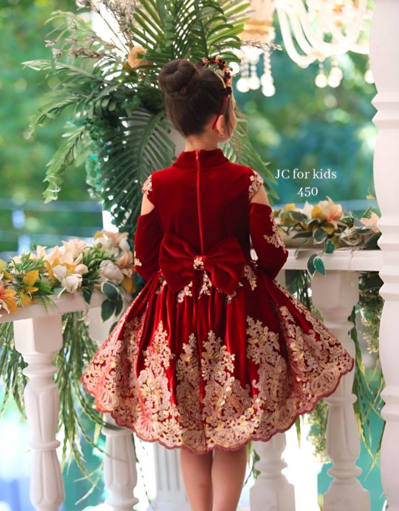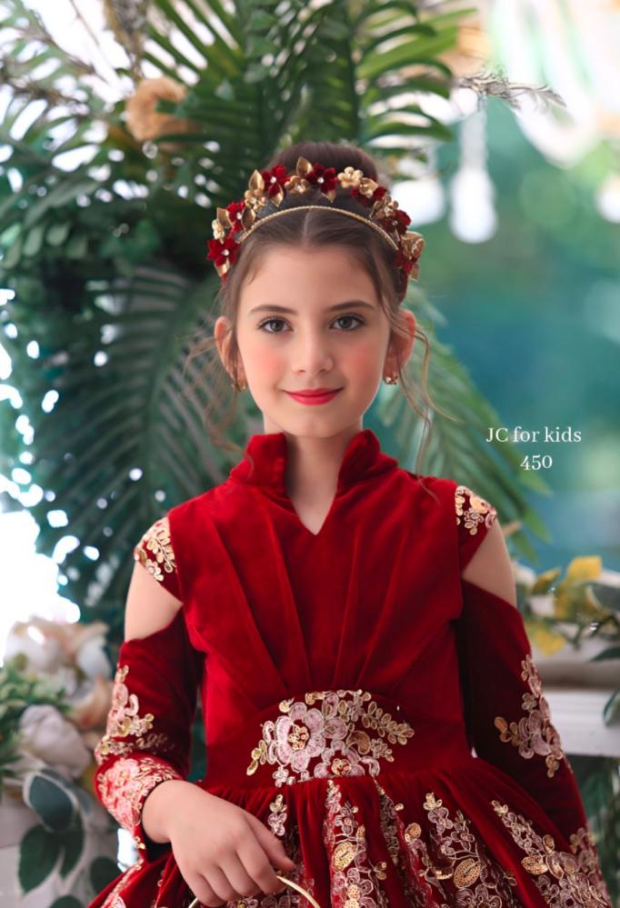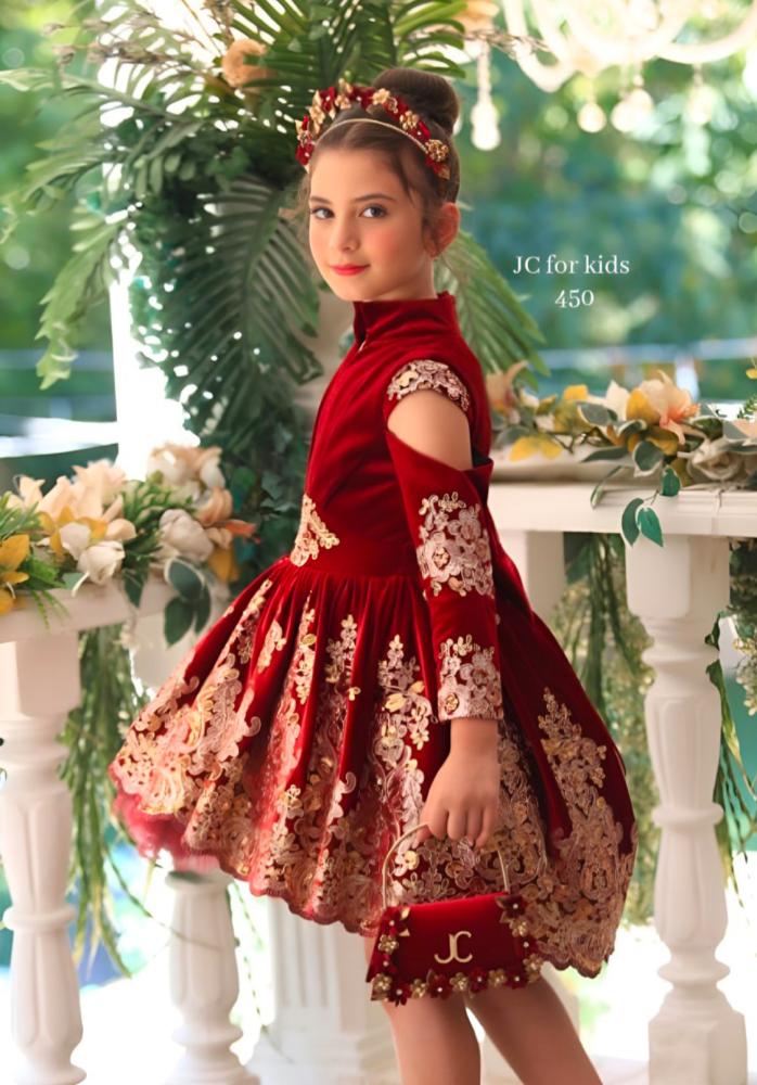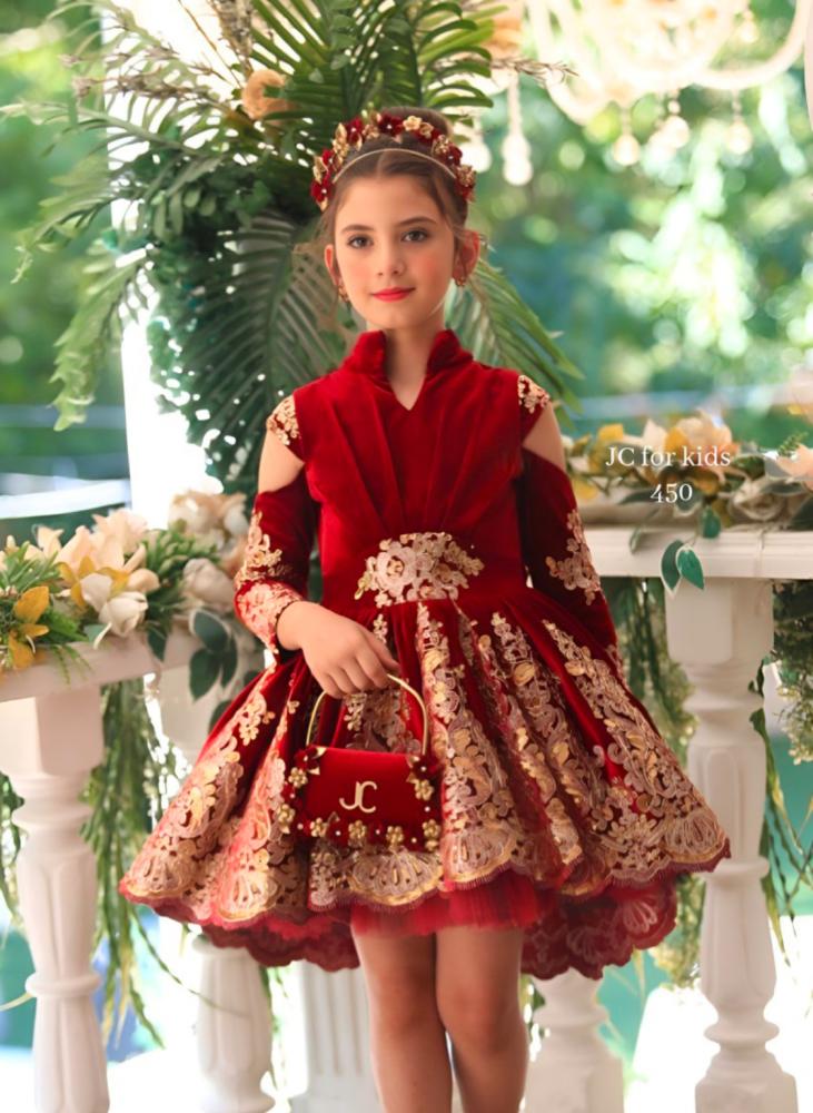 فستان بالشك لون أحمر + شنطه + اكسسوار شعر